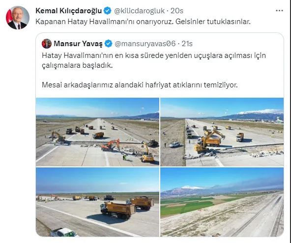 CHP lideri Kemal Kılıçdaroğu, ABB Başkanı Mansur Yavaş'ın Tweet'ini alıntılayarak "Kapanan Hatay Havalimanı'nı onarıyoruz. Gelsin tutuklasınlar" ifadelerinin yer aldığı bir paylaşım yaptı.