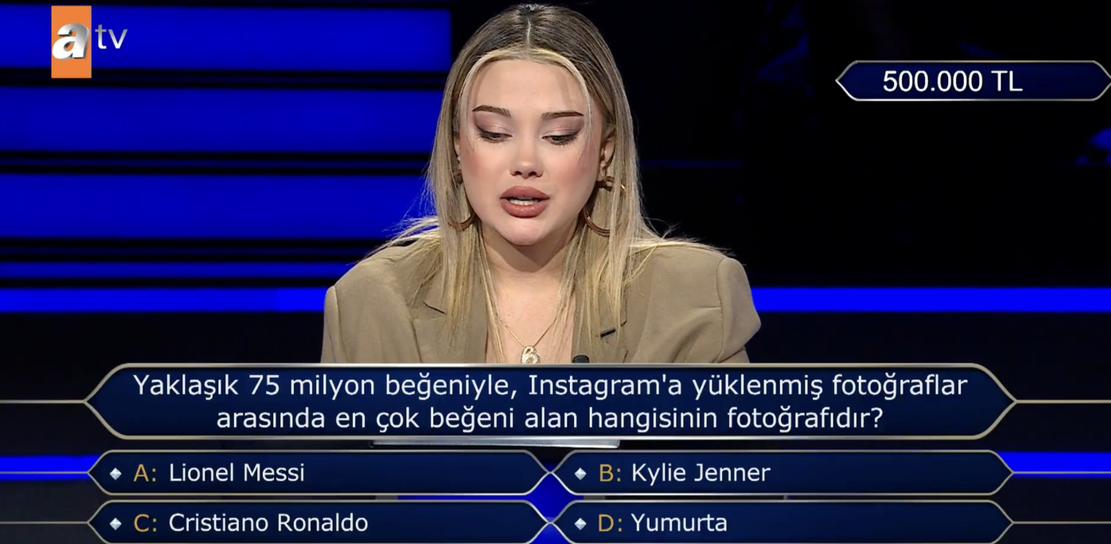 Yarışmanın bu aşamasına gelmeyi başaran yarışmacı, daha önce yöneltilen tüm soruları doğru yanıtlayarak önemli bir başarıya imza atarken, 500 bin TL’lik soru karşısında uzun süre düşünmek zorunda kaldı. Sorunun zorluk seviyesi, sosyal medyada da kısa sürede gündem olurken, izleyiciler kendi aralarında doğru cevabı tartışmaya başladı.