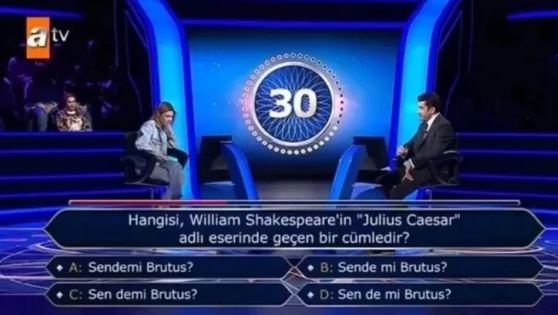 Yarışmaya ablasıyla birlikte katılan Simay'ın 5 bin lira değerindeki 4'üncü soruda karşısına 'Hangisi, William Shakespeare'in "Julius Caesar" adlı eserinde geçen bir cümledir?' sorusu çıkmıştı.