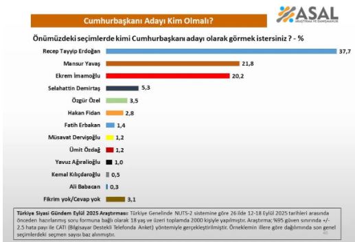 Asal Araştırma, Türkiye’nin siyasi gündeminin yoğunlaştığı bir dönemde seçmenlere “Önümüzdeki seçimlerde kimi cumhurbaşkanı adayı olarak görmek istersiniz?” sorusunu yöneltti.