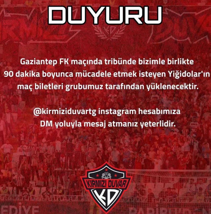 Sivasspor'un yeni kurulan taraftar grubu "Kırmızı Duvar" sosyal medya hesabı üzerinden heyecan verici bir duyuru yaptı. Gaziantep FK ile oynanacak karşılaşmada, stadyumda Sivasspor'u desteklemek isteyen taraftarlara büyük bir jest yapıldı. Yapılan açıklamaya göre, karşılaşmayı canlı izlemek isteyen taraftarların biletleri "Kırmızı Duvar" grubu tarafından yüklenecek.