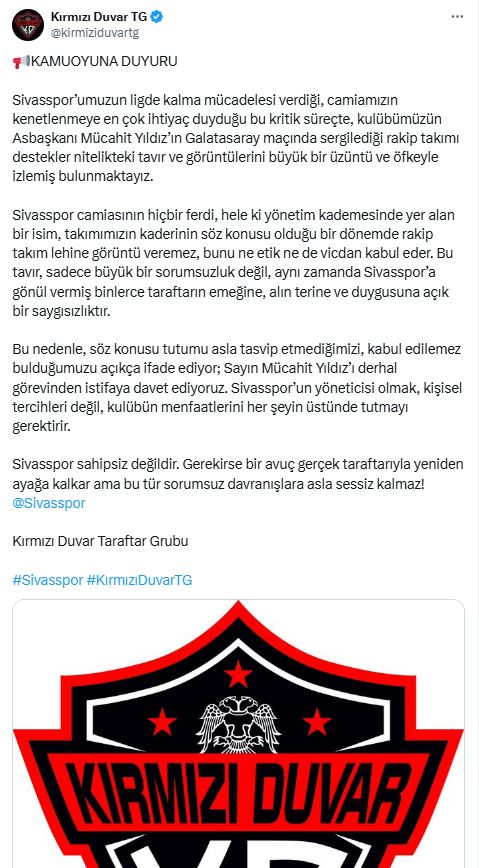 Sivasspor’un taraftar grubu Kırmızı Duvar, Galatasaray karşılaşmasının ardından kulübün Asbaşkanı Mücahit Yıldız’ın maçta sergilediği tavırlara sert tepki gösterdi.