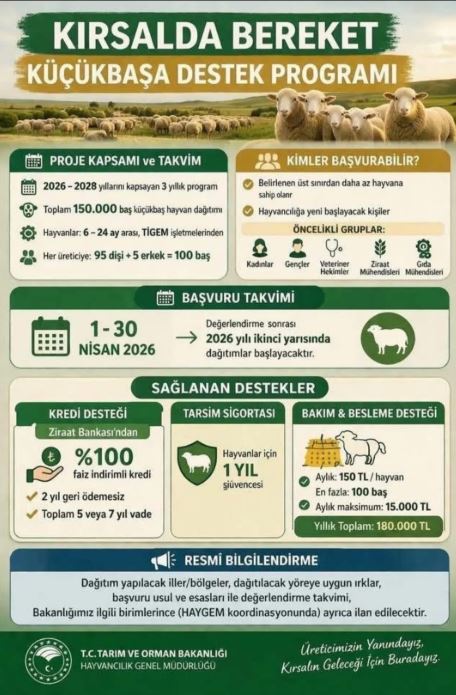 Başvurular 1-30 Nisan 2026 tarihleri arasında yapılacak. Değerlendirme sürecinin ardından dağıtımların 2026 yılının ikinci yarısında başlaması planlanıyor. Proje kapsamında Türkiye genelinde toplam 150 bin küçükbaş hayvanın dağıtılması hedefleniyor.