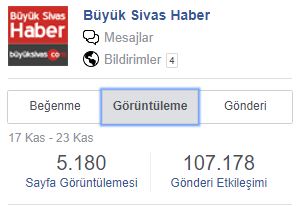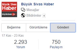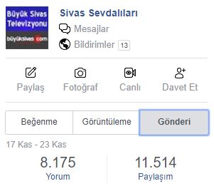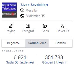 1 hafta içerisinde gönderilerimiz Sivas Sevdalıları sayfamızda 351.000'den fazla etkileşim almışken, bu sayı Büyük Sivas Haber'de 107.000'den fazla... Yani toplamda Facebook hesaplarımızdan yaptığımız paylaşımların 1 haftada 450.000'den fazla etkileşim elde ettiği görülüyor.