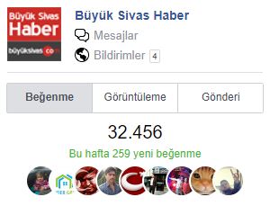 1 hafta içerisinde gönderilerimiz Sivas Sevdalıları sayfamızda 351.000'den fazla etkileşim almışken, bu sayı Büyük Sivas Haber'de 107.000'den fazla... Yani toplamda Facebook hesaplarımızdan yaptığımız paylaşımların 1 haftada 450.000'den fazla etkileşim elde ettiği görülüyor.