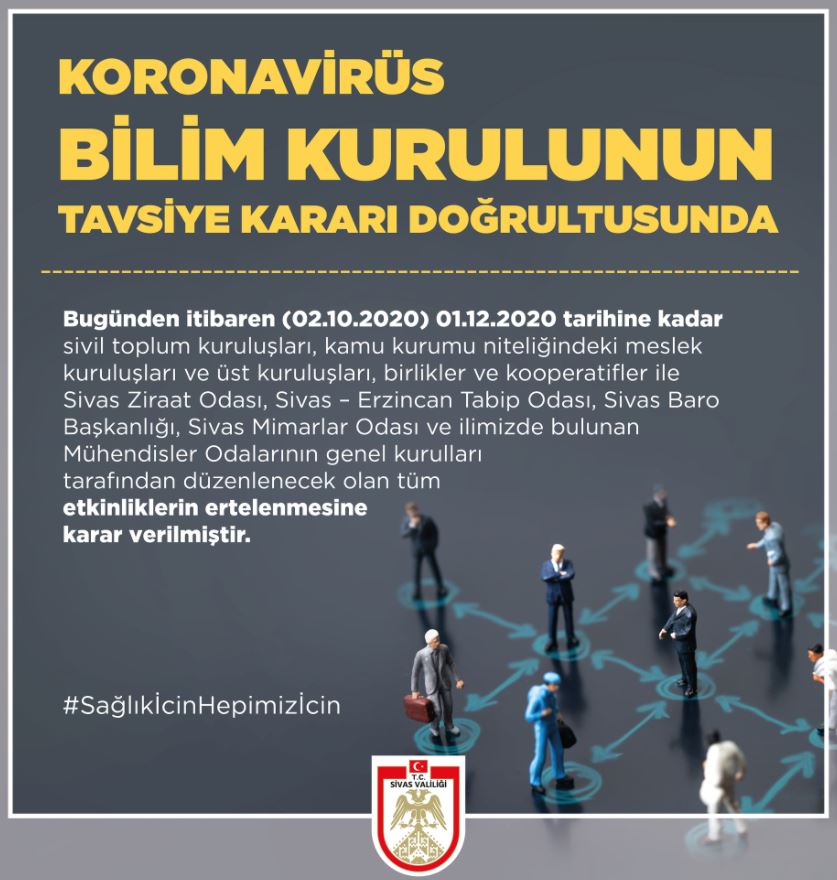 İlimiz Sivas'ta koronavirüs ile mücadele üst seviyede alınan önlemler ile devam ederken buna bir yenisi daha eklendi. Sivas Valiliği'nin yaptığı paylaşımda bir çok kurum kuruluşun genel kurulları tarafından düzenlenecek olan tüm etkinliklerin ertelenmesine karar verilmiştir dendi.