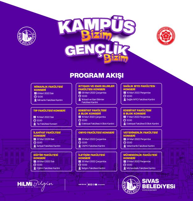 "Gençler eğlenceye hazır mıyız?" diyerek duyurduğu Üniversite öğrencilerine yönelik "Kampüs bizim, gençlik bizim" etkinliği kapsamında Mart boyunca Sivas Belediyesi konser düzenleyecek çekiliş yapacak ve hediyeler dağıtacak.