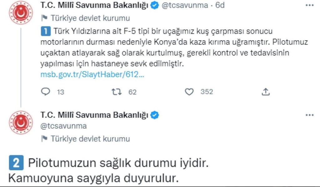 Açıklamada, "Türk Yıldızları ekibine ait F5 uçağı, kuş çarpması sonucu motorlarının durması nedeniyle Konya'da kaza kırıma uğradı. Uçaktan atlayarak kurtulan pilotun sağlık durumu iyi." denildi.-ensonhaber
