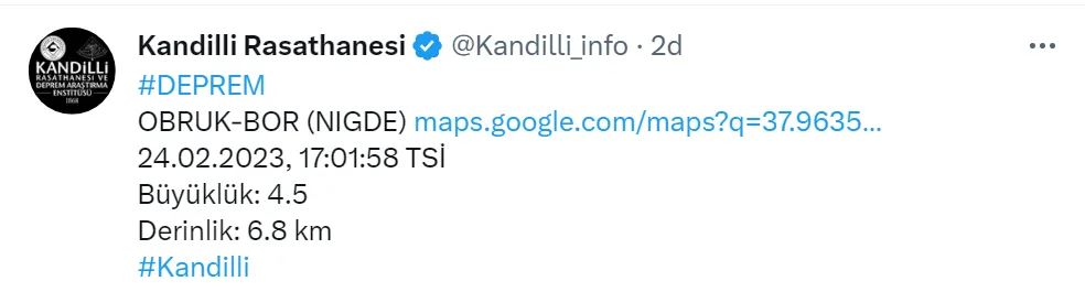 Kandilli Rasathanesi ise depremin merkezinin Niğde'nin Bor ilçesi olduğunu ve şiddetinin de 4.5 olduğunu duyurdu. Deprem yerin 6.8 kilometre derininde yaşandı.
