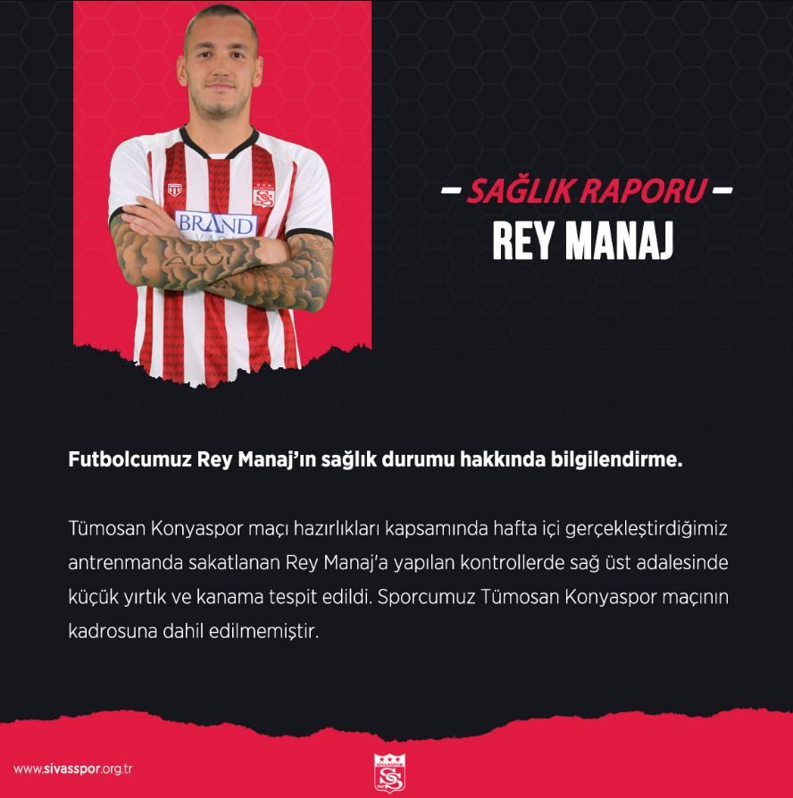 EMS Yapı Sivasspor'da golcü oyuncu Rey Manaj, adalesinde tespit edilen yırtık nedeniyle Trendyol Süper Lig'in 15. haftasında bugün oynanacak TÜMOSAN Konyaspor maçı kadrosuna dahil edilmedi.