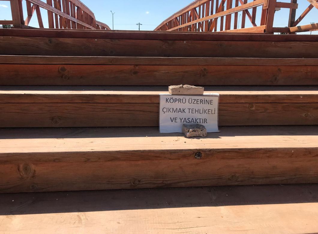Halka açık sosyal alan içerisinde yer alan gölet üzerine inşaa edilen ve üzerine çıkarak karşı tarafa geçilmek için yapılan köprüde "KÖPRÜ ÜZERİNE ÇIKMAK TEHLİKELİ VE YASAKTIR" yazısı yer aldı.