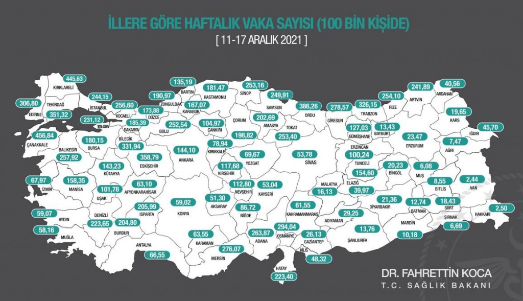 Bakan Koca haritayı, "11-17 Aralık arasında, 100.000 kişi içinde bir haftalık toplam yeni Covid-19 vaka sayısı il bazında neydi? Bilgiler, haftalık İnsidans haritasında." notuyla paylatı.