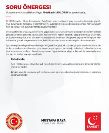 Önergesinde, bölgede sık sık kazaların meydana geldiğine dikkat çeken Kaya, yaklaşık 3-4 kilometrelik yol güzergâhının aydınlatılmamasının hem sürücüler hem de yayalar için ciddi risk oluşturduğunu belirtti.