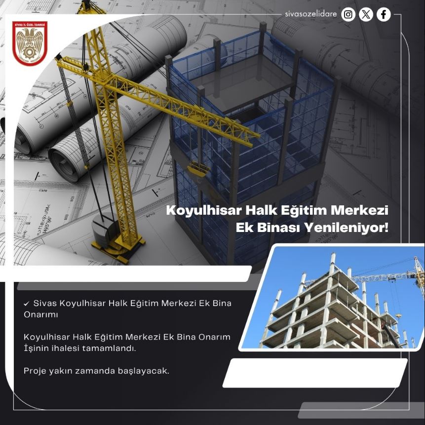 Sivas İl Özel İdaresi tarafından yürütülen yatırımlar kapsamında, Koyulhisar Halk Eğitim Merkezi Ek Bina Onarımı işinin ihalesi tamamlandı.
