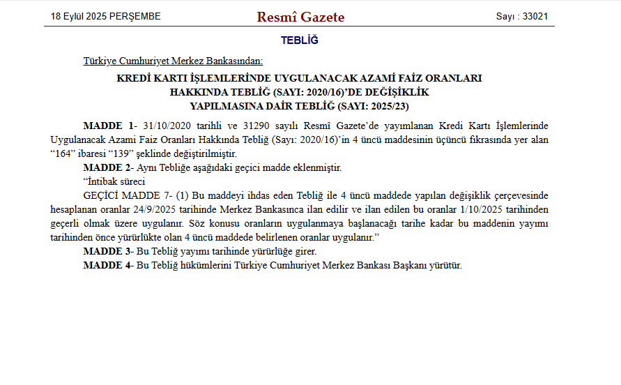 Yapılan düzenlemenin 1 Ekim 2025 tarihinden itibaren yürürlüğe gireceği açıklandı.