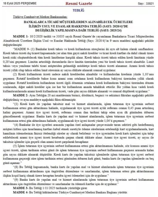 Yeni düzenlemeyle birlikte kredi kartı nakit çekim ve kredili mevduat hesabı faizleri 25 baz puan düşürüldü. Buna göre;