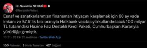 Bakan Nebati, sosyal medya hesabından esnaf ve sanatkarların finansman ihtiyacını karşılamak için 60 ay vade imkanı ve yüzde 7,5’lik faiz oranıyla kullandırılacak 100 milyar TL tutarındaki Hazine Faiz Destekli Kredi Paketi'nin Cumhurbaşkanı Kararı'yla yürürlüğe girdiğini açıkladı.