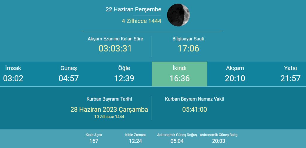 Kurban Bayramı 28 Haziran 2023 Çarşamba günü başlıyor. Diyanet İşleri Başkanlığı tarafından belirlenen illere göre bayram namazı saatleri şöyle;