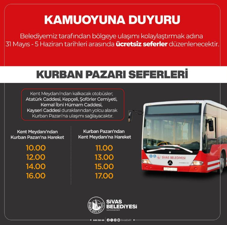 Sivas Belediyesi tarafından bu yıl Kovalı mevkiinde kurulan Kurban Pazarı’na vatandaşların kolay ulaşım sağlaması amacıyla ücretsiz otobüs seferleri düzenleniyor.