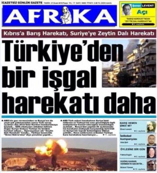 KKTC'de yayın yapan Afrika gazetesi Türkiye'nin Afrin operasyonunu eleştirerek, harekatı işgal olarak nitelendirdi.