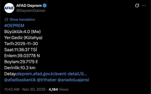 AFAD verilerine göre merkez üssü Gediz olan 4.0 büyüklüğünde bir deprem meydana geldi.