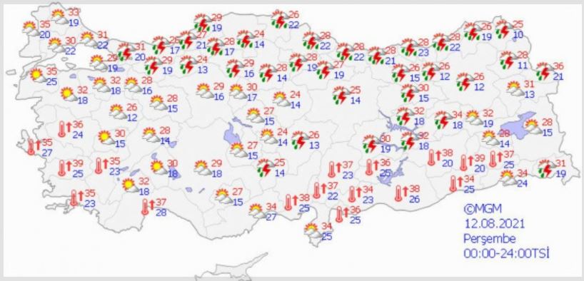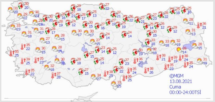 Diğer bölgelerde ise hava durumunda önemli bir değişiklik olmazken, meteoroloji bazı şehirlerde çok kuvvetli yağış ihtimaline karşı uyardı.