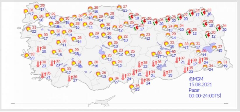 Yurdun kuzey, iç ve doğu kesimlerinin parçalı ve yer yer çok bulutlu olması bekleniyor. Karadeniz, Doğu Anadolu’nun kuzey ve batısı, Kocaeli, Sakarya, Bilecik, Niğde, Kayseri, Sivas, Çankırı, Hakkari çevreleri, Orta ve Doğu Akdeniz’in Toroslar kesimi, Ankara'nın kuzeyi ile Van’ın doğusunun yerel olmak üzere aralıklı sağanak ve gök gürültülü sağanak yağışlı, diğer yerlerin az bulutlu ve açık geçeceği tahmin ediliyor.