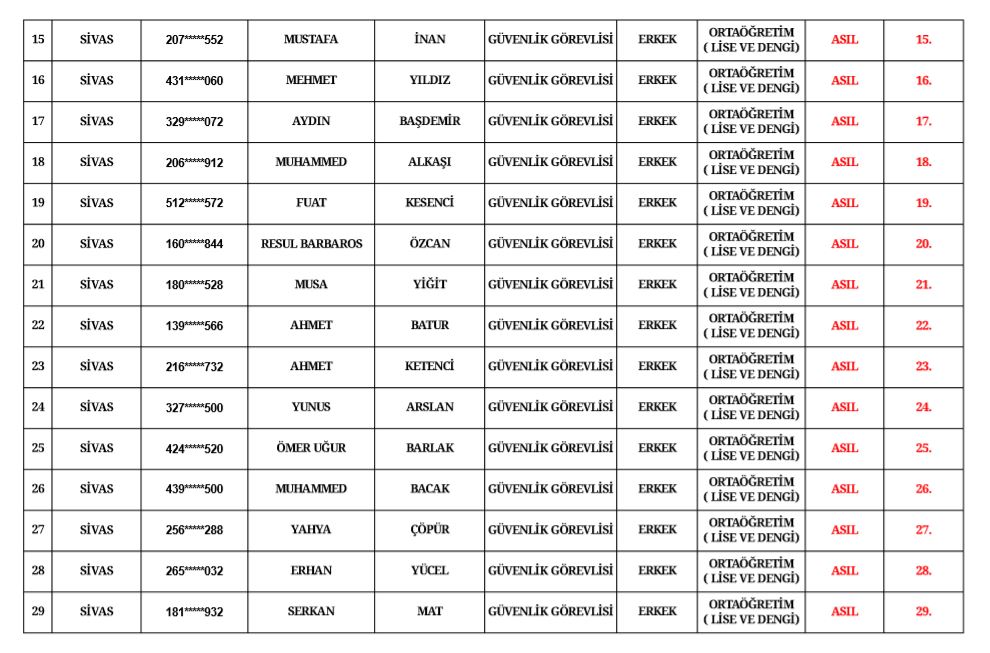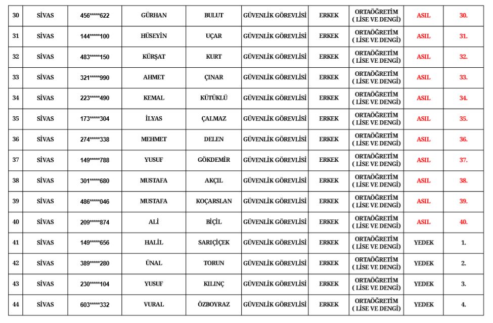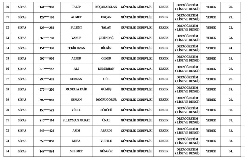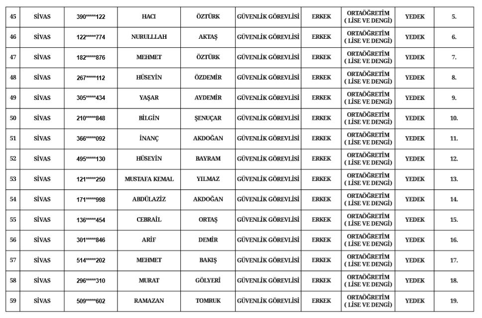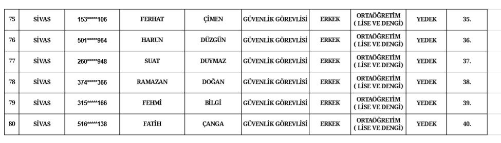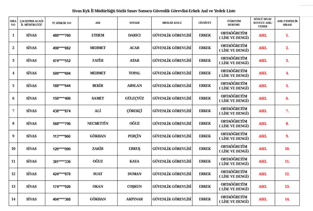 Sivas KYK İl Müdürlüğü Sözlü Sınav Sonucu Güvenlik Görevlisi Erkek Asıl ve Yedek Liste