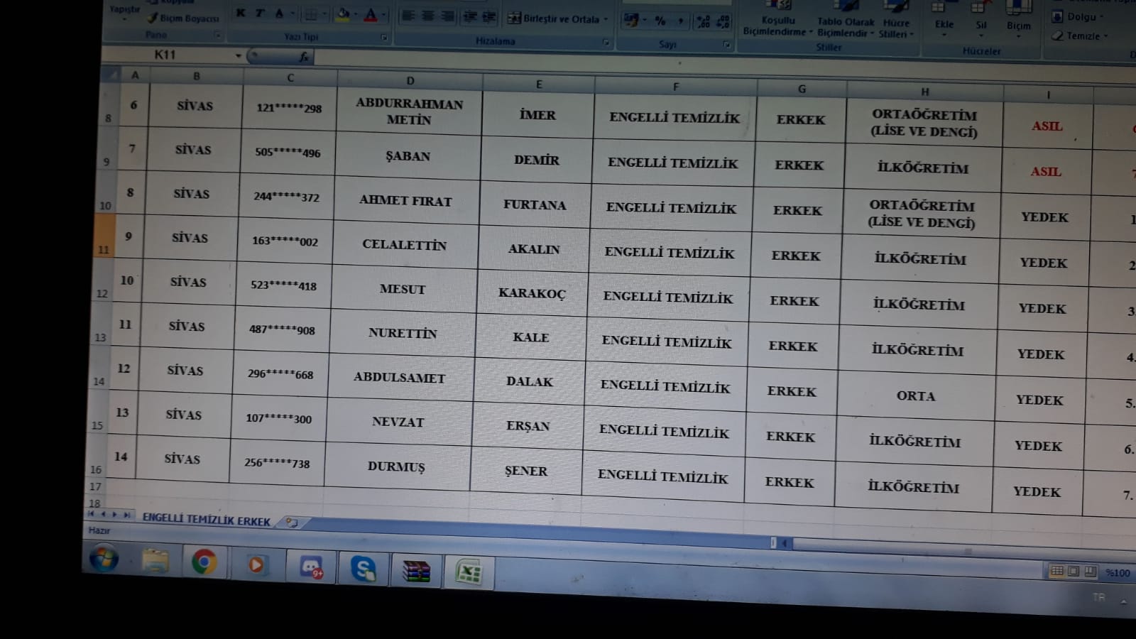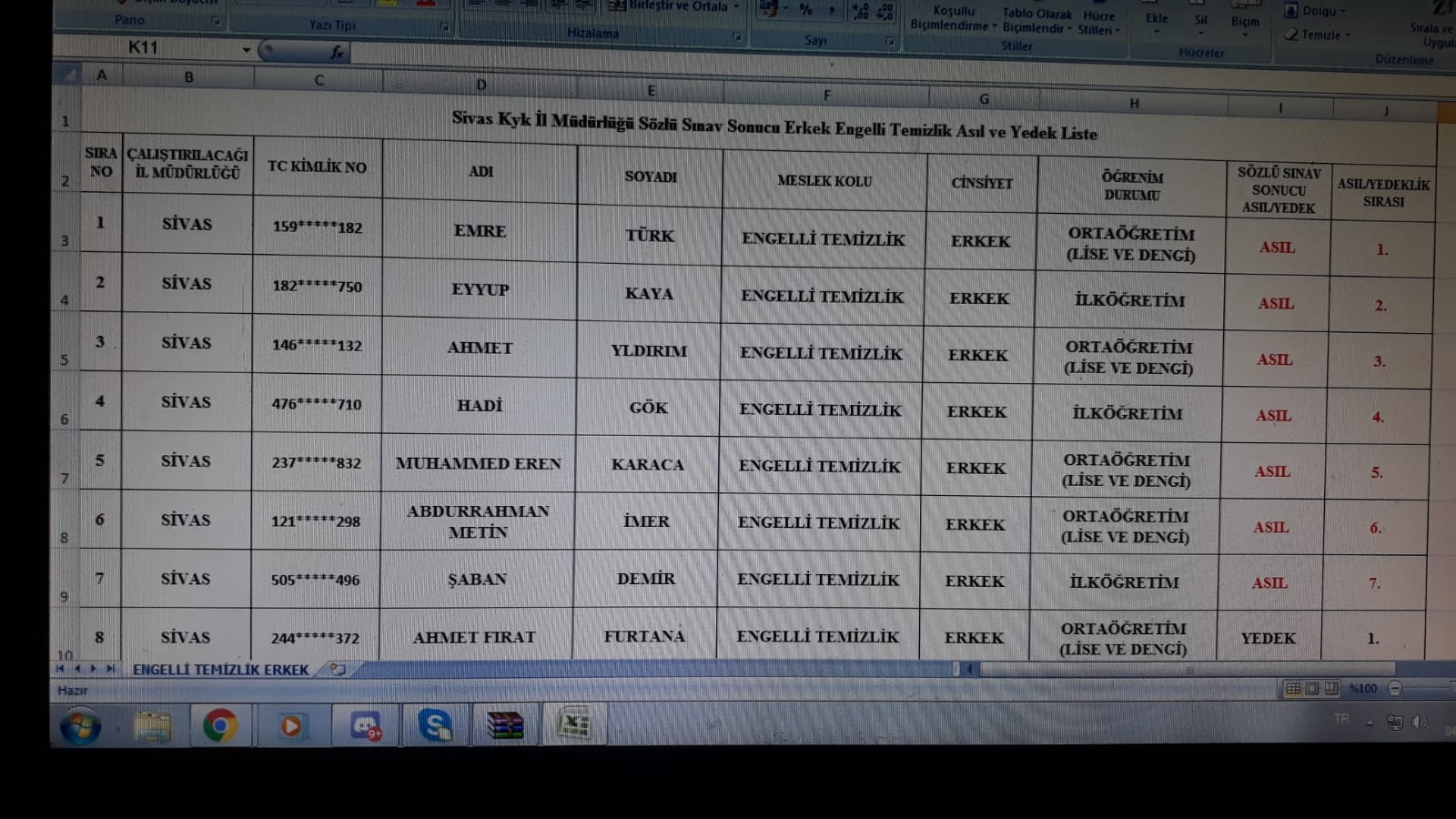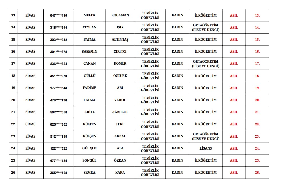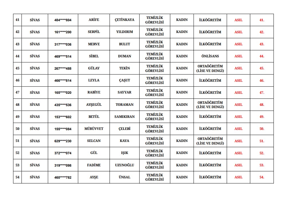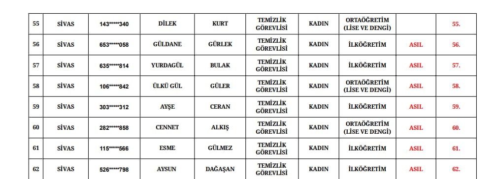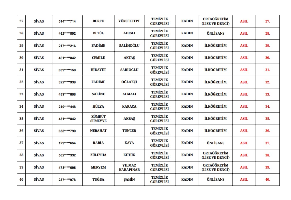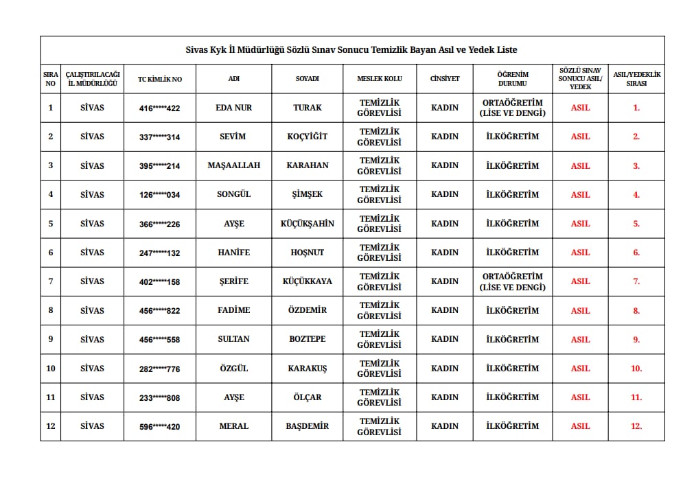 Sivas KYK İl Müdürlüğü Sözlü Sınav Sonucu Temizlik Görevlisi Bayan Asıl ve Yedek Liste