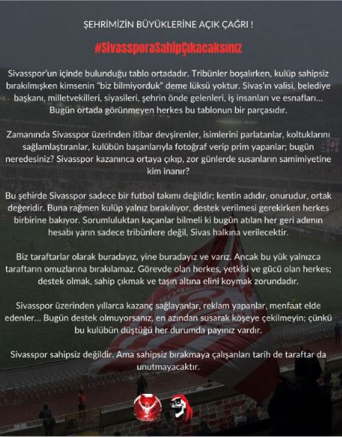 Taraftarlar açıklamanın sonunda, “Biz buradayız, yine buradayız ve varız. Ancak bu yük sadece taraftarın omuzlarında taşınamaz. Herkes elini taşın altına koymak zorundadır. Sivasspor sahipsiz değildir, ama sahip çıkmayanlar tarihte taraftarın hafızasında unutulmayacaktır” sözleriyle çağrılarını yineledi.