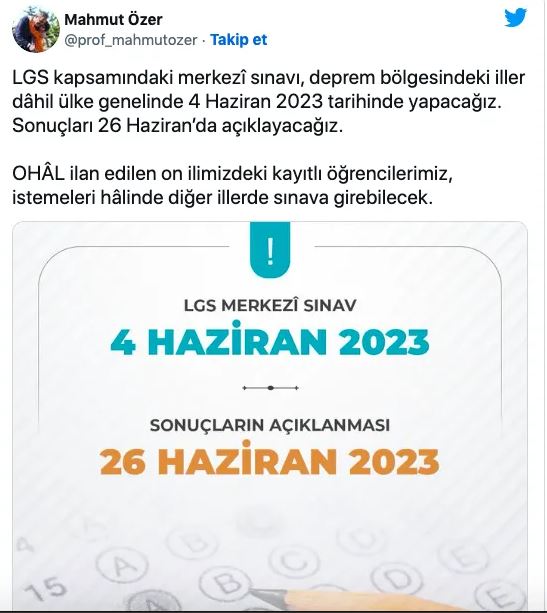 LGS kapsamındaki merkezî sınavı, deprem bölgesindeki iller dâhil ülke genelinde 4 Haziran 2023 tarihinde yapacağız. Sonuçları 26 Haziran’da açıklayacağız. OHAL ilan edilen on ilimizdeki kayıtlı öğrencilerimiz, istemeleri hâlinde diğer illerde sınava girebilecek.