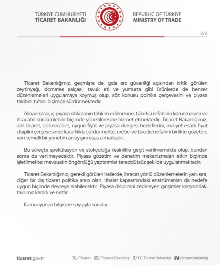 Açıklamada, alınan kararın iç piyasa istikrarının sağlanması, tüketici refahının korunması ve ihracatın sürdürülebilir biçimde yönetilmesine hizmet edeceği kaydedildi. Ticaret Bakanlığı, “Üretici ve tüketici refahını birlikte gözeten, veri temelli bir yönetim anlayışını esas alıyoruz” ifadelerine yer verdi.