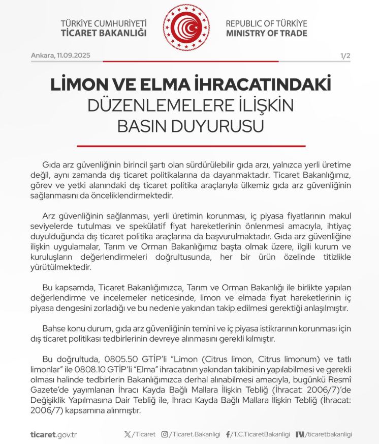 Bakanlıktan yapılan açıklamada, gıda arz güvenliğinin sürdürülebilir gıda arzına dayandığı vurgulanarak, ihtiyaç halinde dış ticaret politika araçlarının devreye sokulduğu ifade edildi. Tarım ve Orman Bakanlığı ile yapılan değerlendirmeler sonucu limon ve elma ihracatında fiyat hareketlerinin iç piyasa dengesini zorladığına dikkat çekildi.
