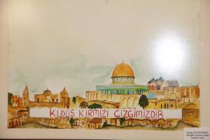 Kudüsün öneminin anlatılmaya çalışıldığı sergide öğrenciler, Kudüsle ilgili düşüncelerini afişe ve resme döktü. Sergide 25 yağlı boya resim ve 15 afiş yer alıyor.