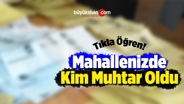 Pazar günü gerçekleştirilen seçimlerin ardından resmi olmayan sonuçlara göre Sivas´ta mahalle muhtarlıklarını kazanan isimler ve görev yerleri şu şekilde oldu: Alibaba (İbrahim Tozkoparan), Abdulvahabigazi (Gazi Düzarduç), Ahmet Turangazi (Asım Boyuneğmez), Akdeğirmen (Hikmet Coşkun), Altuntabak (Fatih Yılmaz), Aydoğan (Yusuf Baloğlu), Bahtiyar Bostan (Hamdi Demirhan), Çarşıbaşı (Hekmet Yücedağ), Çayboyu (Mustafa Doğan), Çayyurt (Necip Köse), Çiçekli (Doğan Yazıcı), Danişmentgazi (Çetin Yıldırım), Dedebalı (Nusret Aydın), Demircilerardı (Muzaffer Karakaya), Diriliş (Behzat Can), Dört Eylül (Numan Kaya), Ece (Sami Dinler), Eğriköprü (Mehmet Güler), Emek (Muharrem Erbaş), Esentepe (Celal Şanlı), Esenyurt (Halil İbrahim Polat), Eskikale (İsmail Küngüs), Fatih (Mehmet Kimsesiz), Ferhat Bostan (Muhabbet Olgaç), Gökçebostan (Fatih Temel), Gökmedrese (Nuri Solmaz), Gültepe (Ahmet Turan Dağaşan), Gülyurt (Cesur Babacan), Halil Rıfat Paşa (Vedat Susuz), Huzur (Orhan Ala), İnönü (Ahmet Seviş), İstiklal (Cemalettin Arslan), Kadı Burhanettin (Mehmet Akif Şahinler), Kaleardı (Ayhan Elbay), Kardeşler (Mustafa Güler), Karşıyaka (Çetin Aydın), Kılavuz (Ebuzer Akpolat), Kızılırmak (Bilal Meriç), Küçükminare (Yusuf Akay), Kümbet (Erol Çakmak), Mehmet Akif Ersoy (Mehmet Hazman), Mehmet Paşa (Hakan Öztürk), Mevlana (Kazım Gözel), Mısmılırmak (Mehmet Elagöz), Mimar Sinan (Ertan Koç), Orhangazi (Dursun Yıldız), Örtülüpınar (Rüşdü Delice), Paşabey (Ahmet Yıldız), Pulur (Ogün Bekçioğlu), Şeyh Şamil (İbrahim Nar), Selçuklu (Mustafa Kemal Işık), Seyrantepe (Erdal Yılmaz), Sularbaşı (Necdet Sulkalar), Tuzlugöl (Mesut Erbaş), Cami-i Kebir (Şükrü Yazıcılar), Uzuntepe (Necati Mert), Üçlerbey (Ahmet Tecer), Yahyabey (Muhittin Admış), Yeni Mahalle (Halis Güneş), Yenidoğan (Mehmet Şener), Yenişehir (Fatih Kaynar), Yeşilyurt (Hüseyin Polat), Yiğitler (Ömer Toprak), Yunus Emre (Adnan Çinko), Yüceyurt (Hayati Şirvan). (İrade)