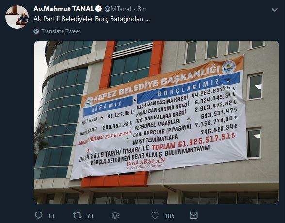 Çanakkale Kepez Belediyesi’nin bir önceki dönemde de CHP’nin yönetiminde olduğundan bihaber olan ve bu afişi resmi sosyal medya hesabından paylaşan CHP’li Mahmut Tanal ise, “AK Partili belediyeler borç batağından…” ifadesini kullandı.