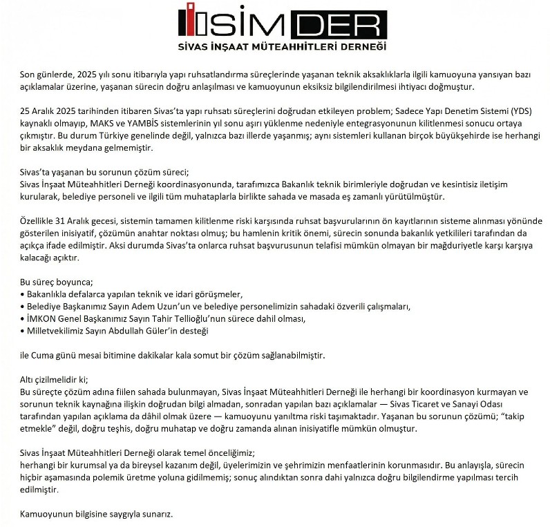 Yeni yıldan önce ruhsat harçlarının artacağı beklentisiyle başvuruların yıl sonuna yığılması, Sivas Belediyesi’nin MAKS’a veri girişlerinde yetişememesine yol açtı. Bu nedenle belediye tarafından müteahhitlerden ön kayıt alındığı, ancak sistemsel engeller sebebiyle yılbaşı öncesinde kesin işlemlerin yapılamadığı öğrenildi.