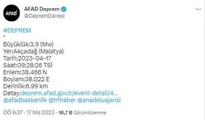 Malatya'da deprem meydana geldi. Depremin Akçadağ ilçesi merkezli gerçekleştiğini paylaşan AFAD, depremin şiddetini ise 3.9 olarak duyurdu.