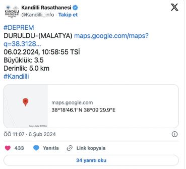 Kandilli Rasathanesi, Malatya'da 3,5 büyüklüğünde deprem meydana geldiğini duyurdu.