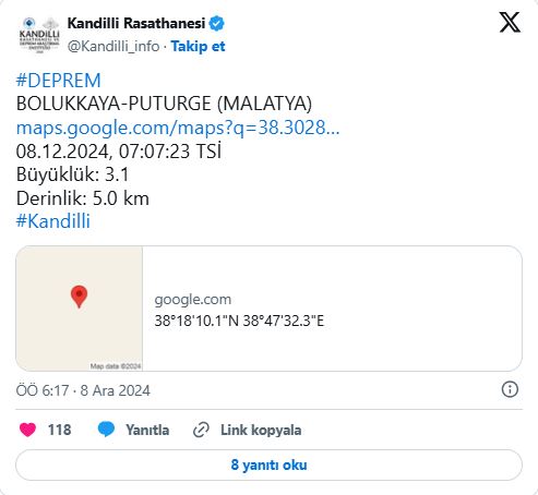 Kandilli Rasathanesi'nin sosyal medya hesabından yapılan açıklamaya göre, Malatya'nın Pütürge ilçesinde 3.1 büyüklüğünde bir deprem meydana geldi. Bölükkaya mevkiindeki deprem saat 07.07'de 5 kilometre derinlikte gerçekleştiği belirtildi.