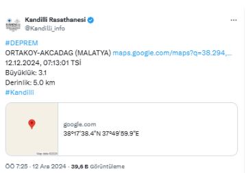 Kandilli Rasathanesi'nden yapılan açıklamaya göre, Merkez üssü Malatya Ortaköy'de 3.1 büyüklüğünde deprem gerçekleşti. Deprem saat 07: 13'de derin 5.0 km derinliğinde oldu.