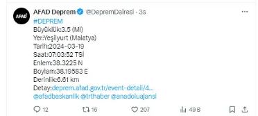 Malatya'nın Yeşilyurt ilçesinde 3.5 büyüklüğünde bir deprem meydana geldi.