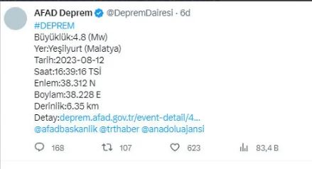 Malatya'nın Yeşilyurt ilçesinde saat 16.39'da 4.8 büyüklüğünde bir deprem meydana geldi. AFAD depremin 6.35 km derinlikte olduğunu duyurdu.