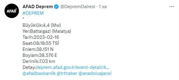 Malatya'nın Battalgazi ilçesinde deprem meydana geldi. AFAD'dan yapılan açıklamaya göre saat 08:18'de meydana gelen deprem 7.03 kilometre derinlikle kaydedildi.