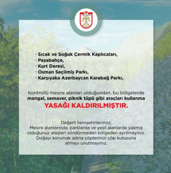 #DogaEvimiz" açıklaması ile mesire yerlerindeki mangal semaver yasağının kaldırıldığı öğrenildi.
