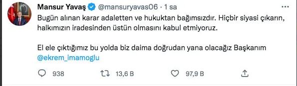 Ankara Büyükşehir Belediye Başkanı Mansur Yavaş, karara ilişkin Twitter'dan paylaşımda bulunarak İmamoğlu'na destek çıktı.