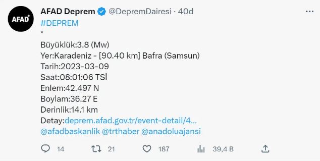 Öte yandan bu sabah bir deprem de Samsun'da oldu. Bafra ilçesi merkezli saat 08:01'deki depremin şiddeti 3.8 olarak açıklandı.