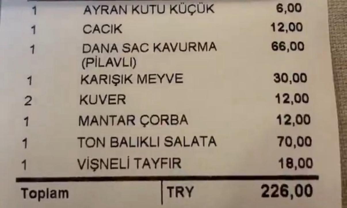 Toplam hesap ise yalnızca 226 TL olarak yansıdı.