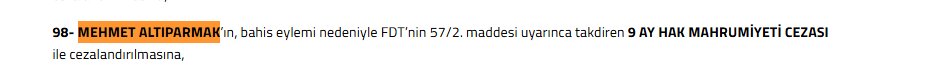 PFDK tarafından yapılan değerlendirmede, Futbol Disiplin Talimatı’nın ilgili maddeleri kapsamında bahisle bağlantılı eylemler nedeniyle ceza uygulanmasına hükmedildi. Karar doğrultusunda Mehmet Altıparmak, 9 ay boyunca futbol faaliyetlerinden men edildi.