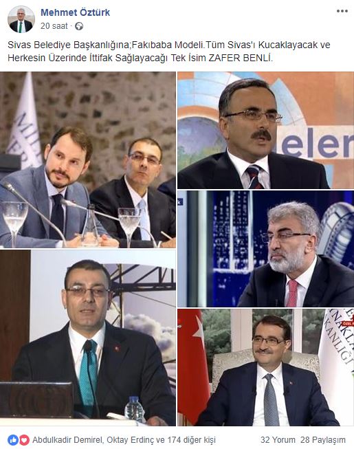 Öztürk "Sivas Belediye Başkanlığına; Fakıbaba Modeli.Tüm Sivas'ı Kucaklayacak ve Herkesin Üzerinde İttifak Sağlayacağı Tek İsim ZAFER BENLİ." şeklinde paylaştığı mesajıyla yeni dönemde Sivas Belediye Başkan adayı Zafer Benli olsun dedi.